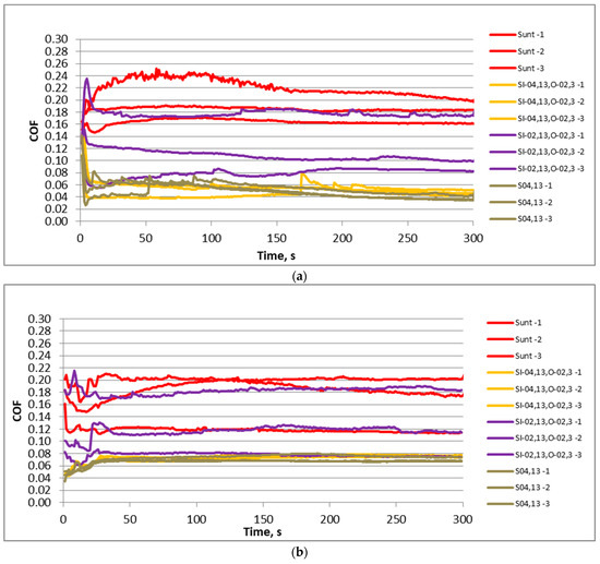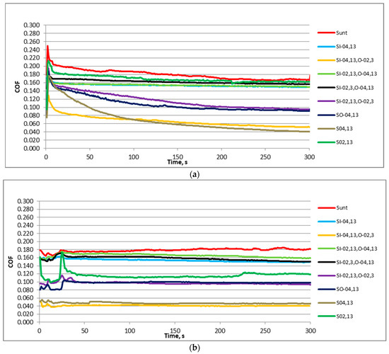 The coefficient of friction versus time for selected sliding pairs with samples Sunt, SI-02,13,O-02,3, SI-04,13,O-02,3 and S04,13 for the normal force of 80 N and the displacement frequency of 20 (a) and 40 Hz (b).
