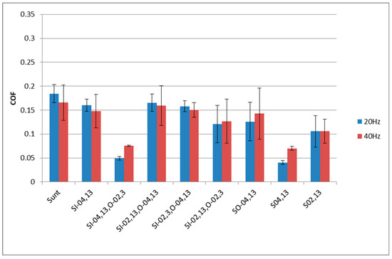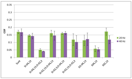 Similar results were obtained when the frequency of oscillations increased to 40 Hz. In most cases, the variation in the friction coefficient increased compared to the operation at a lower frequency of displacement. The highest friction coefficient was obtained for the untextured sample Sunt followed by samples SI-02,13,O-04,13, SI-04,13, SI-02,3,O-4,13, SI-02,13,O-02,3 and SO-04,13. In these six cases, error bars of the coefficient of friction overlapped. The smallest friction occurred for sliding pairs containing samples S04,13 and SI-04,13,O-02,3. These assemblies were also characterized by low friction fluctuation due to repeated tests. The smallest friction variation was achieved by the sliding pair containing sample SI-04,13,O-02,3. The highest reduction was approximately 55%. Disc sample S02,13 led also to a significant reduction in the friction coefficient compared to an untextured sliding pair, of about 40%; however, the variation in the friction coefficient was great.