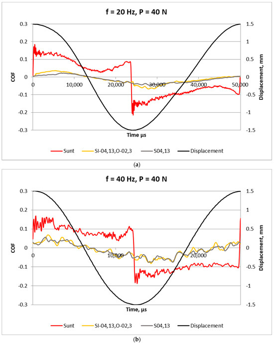 Figure 5 shows representative plots of the friction coefficient in time for the displacement frequencies of 20 Hz and 40 Hz and the normal load of 40 N of various sliding pairs. When the frequency of displacement was lower (Figure 5a), the initial fluctuations in the friction coefficient happened for the first 5 s. Then, the friction coefficient abruptly decreased, and then typically decreased. However, in some cases, after the initial fluctuation, the friction behaved differently; it could increase and decrease, or it increased. Different plots of the friction coefficient were shown for higher frequency of displacement (Figure 5b), especially in the initial phases of the tests. When the frequency of displacement was 40 Hz, the coefficients of friction initially increased, obtaining the highest values after 30–35 s, and then they decreased, and typically obtained stable values after 75–150 s; however, in some cases, fluctuations in the friction coefficient occurred. A high variability in the coefficient of friction for a sliding pair with sample S02,13 was seen for both frequencies of displacement.