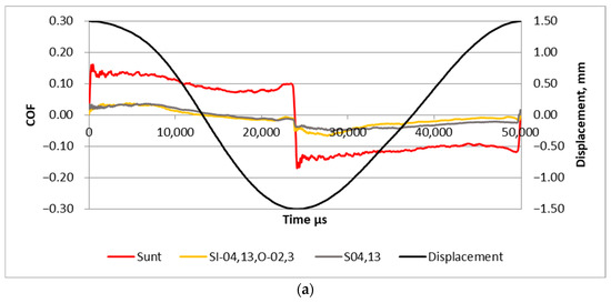 Figure 6 shows graphs of the friction coefficient versus time for three test repetitions of selected sliding pairs for the normal force of 40 N. Independently of the frequency of displacement, the untextured assembly caused the highest friction coefficient, with comparatively high variation. The sliding pair with the disc SI-02,13,O-02,3 led to smaller values and a slightly higher variation of friction coefficient than the untextured sliding pair. The lowest values and fluctuation of the friction coefficient due to test repetitions were achieved for assemblies with samples SI-04,13,O-02,3 and S04,13. These behaviors were found for both displacement frequencies.