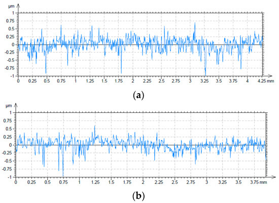 Figure 14 presents roughness profiles of surfaces before (a) and after the tribological tests. During tests, the initial roughness was changed due to truncation of the roughness peaks. The roughness height Ra of untextured samples was 0.13 µm before and 0.1 µm after the test.
