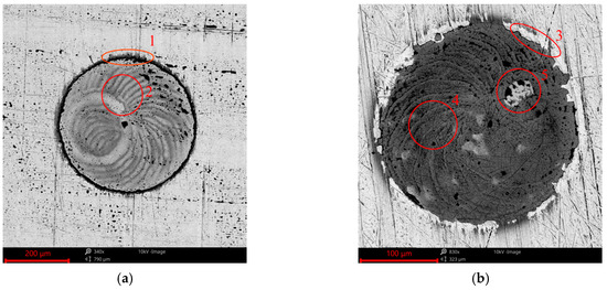 Figure 15 presents SEM images of the dimple before and after the tribologic test. A black ring is visible in Figure 15a (1—black places contain oxygen). This is a material flash created by an oxidized material, which was subjected to laser treatment. Elemental analysis performed using SEM showed that this black area (Figure 15a (1) contained 30–36% oxygen, 28–37% iron, and 30–41% carbon in weight concentration. At the bottom of the dimple, areas of oxidized material are also visible (Figure 15a (2). The bottoms of the oil pockets contained between 16 and 20% oxygen, 21 and 23% carbon and 58 and 60% iron in weight concentration. In the worn sample (Figure 14b), the material flash with oxides was destroyed by contact with the counter-sample, and the native material was opened (Figure 15b (3). In this area, the base material was uncovered and the weight concentration of oxygen was between 1 and 2%. In addition, at the bottom of the dimple, an oxidized material layer was visible (cracked area; Figure 15b (4). In some cases, this layer was detached from the surface (bright area, in which the native material was exposed; Figure 15b (5) due to friction. This phenomenon leads to the presence of wear debris in lubricating oil; however, its effect of increasing wear was negligible (wear was reduced due to the presence of oil pockets).