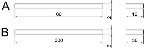 For the practical testing part, the flexible composite structures were designed and manufactured into series of specimens, which were used to test their fatigue behaviour. The design of the individual types of specimens that were tested can be seen in Figure 1 in mm.