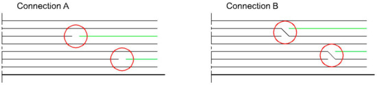 Three groups of specimens were designed to assess the influence of changes in structure on the fatigue behaviour of type B specimens. The first group contained blunt connections (connection A), while the second group contained connections with overlap (connection B). Finally, the third group of specimens contained no connection, only full plies. Figure 2 illustrates the connections A and B.