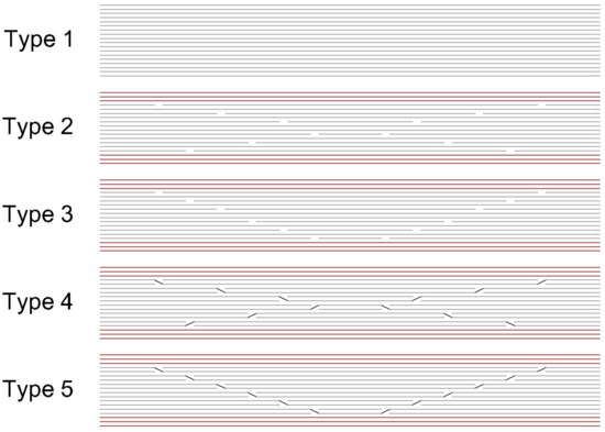 Lay-up diagrams—structures with no connection (Type 1); placement in X shape (Type 2, Type 4) and pyramid outline (Type 3, Type 5).