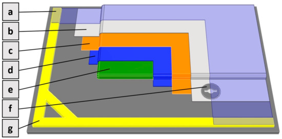 The bleeder 150 UVLS 200, at 150 g/m2, was used in the preparation of the specimens. The flexible polyamide vacuum foil PA180 was utilised as the cover layer of the prepreg plies. This is a universal multi-layer foil with thermal stability up to 180 °C. The sealing element employed in this study was heat-resistant butyl rubber tape, and the requisite quality of the lay-up was ensured by a 30 mm bridge in between the sealing element and vacuum bag. The visualization of this bridge can be seen in Figure 4, specifically in the space between the sealing element (g) and bleeder (b).