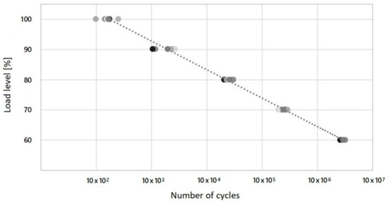 Another parameter that determines the characteristics of a flexible element is its fatigue limit, which is defined as the stress amplitude that does not lead to fatigue failure. This is constrained by the maximum allowable stress and the initial stress. From a maintenance point of view, the test structure must remain fully useable for a defined number of cycles (greater than 2 × 106), which is dependent on the stress coefficient LC, which declines with the increasing number of cycles. The stress coefficient is defined as the ratio of the upper boundary of the loading force FU to the lower boundary of the loading force FD, and the value is always higher than 1 [1,7,8,9].