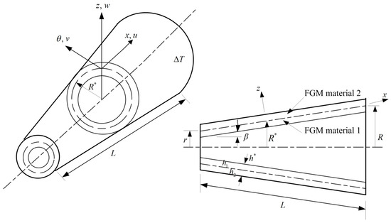 A point (x, , z) of curve coordinates in two constituent materials-laminated FGM conical shells under heating loads with temperature difference is shown in Figure 1 with the thickness of the inner layer constituent material 1 and thickness of the outer layer constituent material 2. L is the length of conical shells. is the total thickness of conical shells. r is the minor middle-surface radius at x = 0, and R is the major middle-surface radius at x = L. is the semi-vertex angle. The power-law function with power law index is used and expressed in material properties (, ) by Hong [11], as follows.