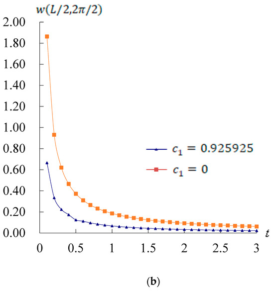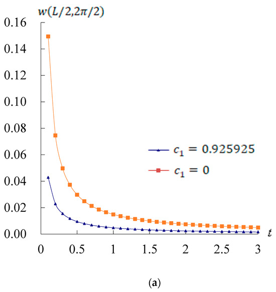 The time responses of are computed with of sinusoidal heat flux and of sinusoidal displacement vibration. Figure 2 shows the responses of (mm) versus t(s) for = 0.925925/mm2 and = 0/mm2, respectively, with L/ = 5 and 10, , , = 0.120708, T = 100 K, = 1 K, and r = 3R/4. The maximum value 0.149393 mm is found at t = 0.1 s for L/ = 5 and = 0/mm2, as shown in Figure 2a. The maximum value 1.863387 mm is found at t = 0.1 s for L/ = 10 and = 0/mm2, as shown in Figure 2b. The values are in decreasing tendencies for both = 0.925925/mm2, = 0/mm2, and L/ = 5, L/ = 10. The values in = 0/mm2 case are greater than that in = 0.925925/mm2 case. The result clearly state the improvement obtained from using this third order derivation TSDT case of = 0.925925/mm2, as opposed to the first or second order derivation case of = 0/mm2.