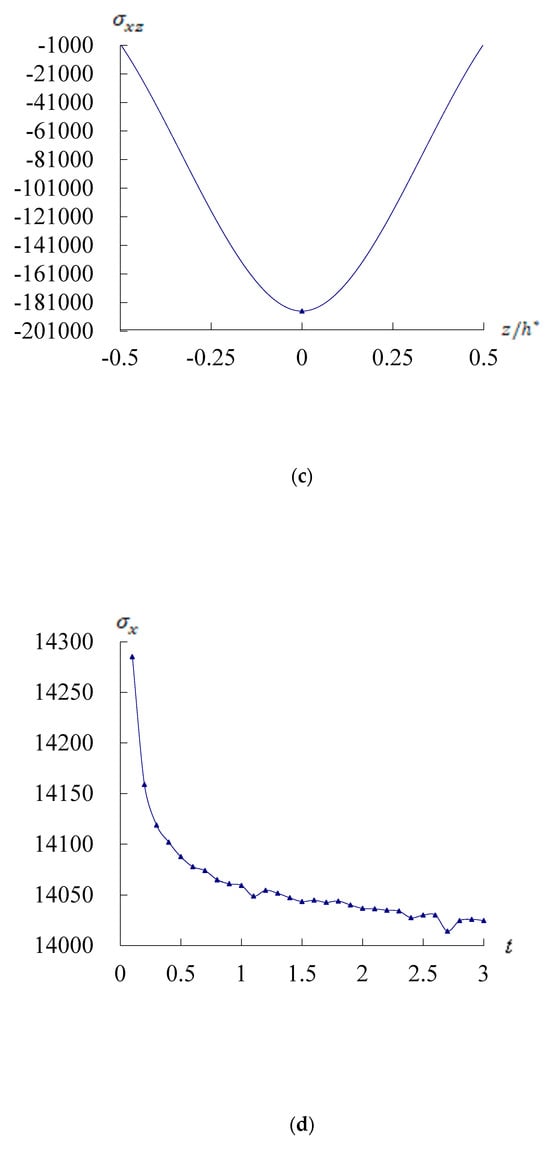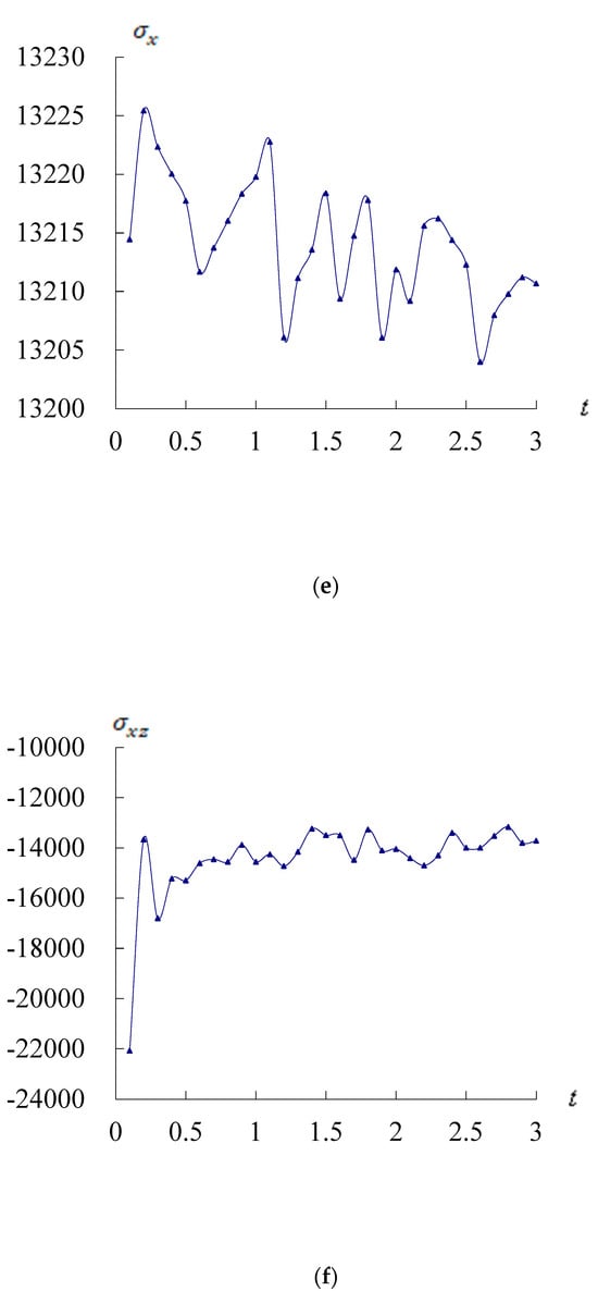 Figure 3 shows the time responses of , , and on x = L/2, for the conical shells. Figure 3a shows the (Pa) versus . Figure 3b,c show the and (Pa) versus , respectively, at t = 3.0 s for = 10, = 0.925925/mm2, = 1, , T = 100 K, = 1 K, and r = 3R/4. The maximum value −1.8715 × 105 Pa is found on z = 0.0 for L/ = 10. The absolute value for −1.8715 × 105 Pa is found on z = 0.0 and in greater value than value 1.3210 × 104 Pa on z = −0.5. Figure 3d,e show the (Pa) time responses on inner surface z = −0.5 for = 1, = 0.925925/mm2, L/ = 5 and 10, respectively. The values of are in decreasing tendencies for = 0.925925/mm2 and L/ = 5. The maximum value 1.3225 × 104 Pa is found at t = 0.2 s and values can be considered in order of 1.32 × 104 Pa for L/ = 10. Figure 3f,g show the time responses of the (Pa) on middle surface z = 0.0 for = 1, = 0.925925/mm2, L/ = 5 and 10, respectively. The maximum absolute value for −4.3348 × 105 Pa is found at t = 0.2 s for L/ = 10.