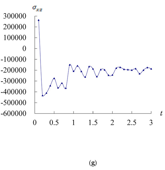Stresses vs. and t with r = 3R/4: (a) (Pa) vs. for L/ = 10; (b) (Pa) vs. for L/ = 10; (c) (Pa) vs. for L/ = 10; (d) (Pa) vs. t(s) for L/ = 5; (e) (Pa) vs. t(s) for L/ = 10; (f) (Pa) vs. t(s) for L/ = 5; (g) (Pa) vs. t(s) for L/ = 10.