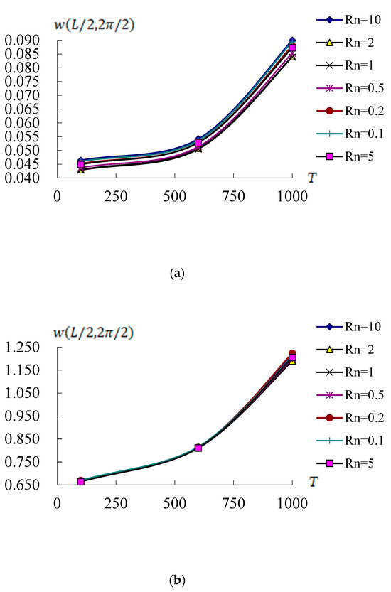 (mm) versus T(K) with r = 3R/4: (a) for L/ = 5 with from 0.1 to 10; (b) for L/ = 10 with from 0.1 to 10.