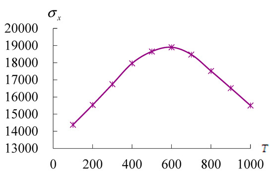 To provide physical justification for (18) used in the GDQ computation as follows, the values of stress along x direction () are functions of symbolic parameters, e.g., displacements (), shear rotations ( ), TSDT coefficient term (), thermal loads temperature amplitude (), environment temperature (T), sinusoidal heat flux frequency (), sinusoidal displacement fundamental frequency (), located curve coordinates (, , z), and at time (t). One of the most important parameters is T to be considered for the stress of FGM and used in higher temperature of environment. To provide the interpretation of the peculiar behavior of on T = 600 K as follows, it is considered the increment 100 K used for T (100 K, 200 K, 300 K, 400 K, 500 K, 600 K, 700 K, 800 K, 900 K, and 1000 K) to calculate the values and interpret the behaviors of . Figure 5 shows the (Pa) on x = L/2, of inner surface z = −0.5 vs. T and = 0.5 for conical shells L/ = 5 with = 1 K and r = 3R/4 at t = 0.1 s. Thus, the curve provided a maximum interpretation of the peculiar behavior of around at T = 600 K. Then, the increment for T (100 K, 600 K, and 1000 K) is used to calculate the values and interpret the behaviors of .