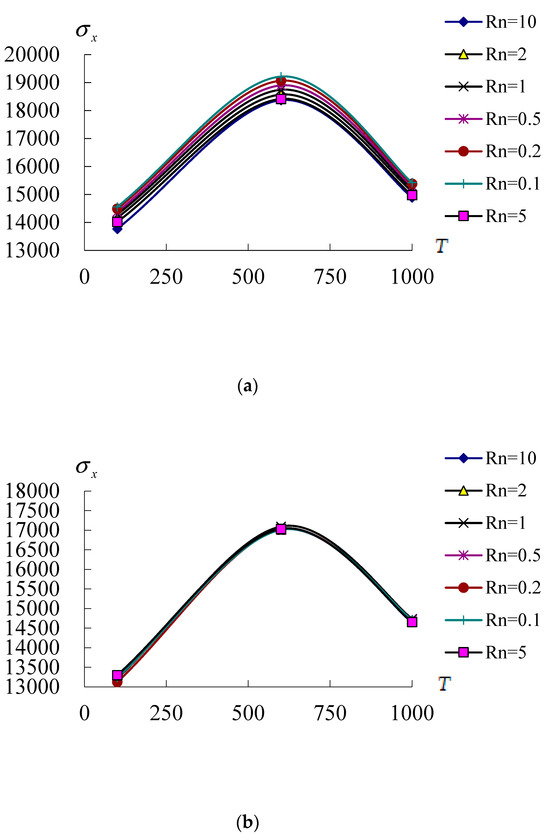 Figure 6 shows the (Pa) on x = L/2, of inner surface z = −0.5 vs. T (100 K, 600 K and 1000 K) and (from 0.1 to 10) for conical shells L/ = 5 and 10 with = 1 K and r = 3R/4 at t = 0.1 s. Figure 6a shows the curves vs. T and for L/ = 5, the values vs. T are all in increasing tendencies from T = 100 K to T = 600 K and then all in decreasing tendencies from T = 600 K to T = 1000 K for all of . The maximum value 1.9215 × 104 Pa is found on T = 600 K and = 0.1. The values of L/ = 5 can withstand on T = 1000 K of environment. Figure 6b shows the curves vs. T and for L/ = 10, they are almost located in the same curves for all value of . The values vs. T are all in increasing tendencies from T = 100 K to T = 600 K, and then all in decreasing tendencies from T = 600 K to T = 1000 K for all of . The maximum value 1.7094 × 104 Pa is found on T = 600 K. The values of L/ = 10 also can withstand on T = 1000 K of environment. Usually, the thermal stress occurred and be stood on the FGMs under thermal loading of extreme high temperatures by Noda [21]. The physical parts on values L/ = 5 and 10 of FGMs can be used in area of airplane engine that usually operate near more than 1000 K of temperatures when the thermal stress to be considered and affected. To understand the effect of thermal loading on the thermal stress, the middle-near 600 K of temperatures can be used to study.
