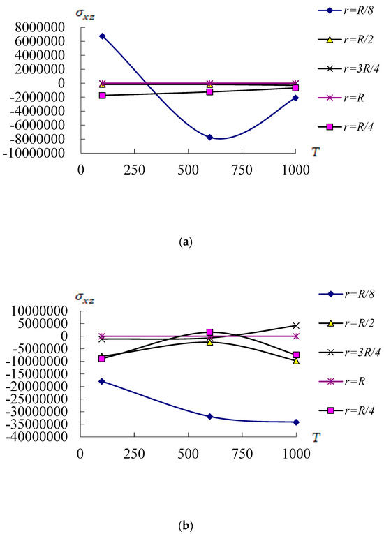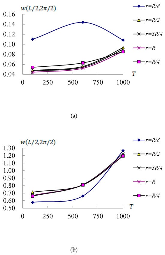 Figure 8 shows the compared values of (Pa) on center position of middle surface z = 0.0 vs. T(100 K, 600 K, and 1000 K) for r(R/8, R/4, R/2, 3R/4, and R) with = 0.925925/mm2. Figure 8a shows the values of vs. T and r in the nonlinear TSDT FGM conical shells for L/ = 5, = 10, , and = 1 K at t = 0.1 s. The maximum value −7.7207 × 106 Pa is found on r = R/8, T = 600 K and L/ = 5. The values vs. T are in increasing tendencies from T = 300 K to T = 600 K and then in decreasing tendencies from T = 600 K to T = 1000 K for the case r = R/8. The values for the case r = R/8 and L/ = 5 can withstand on T = 1000 K of environment. Figure 8b shows the values vs. T and r in the nonlinear TSDT FGM conical shells for L/ = 10, = 0.2, and = 1 K at t = 0.1 s. The maximum value −3.4165 × 107 Pa is found on r = R/8, T = 1000 K and L/ = 10. The values are all in increasing tendencies vs. T from T = 600 K to T = 1000 K for all values of r. The values of the L/ = 10 cannot withstand on T = 1000 K of environment.