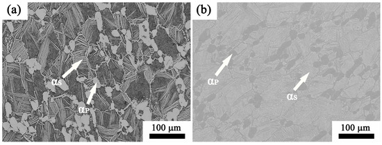 Initial microstructure of Ti65 alloy, including primary α phase (αp) and lamellar α phase (αs): (a) optical metallography image, (b) scanning electron microscopy image.