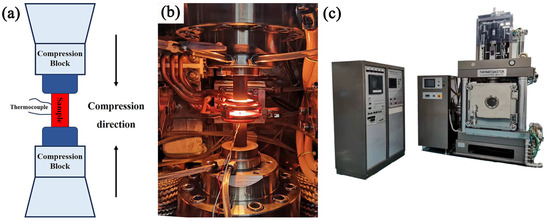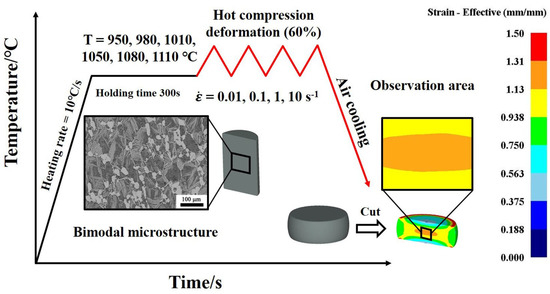 Compression tests were implemented on a Thermecmastor-Z thermal simulator to study the hot working characteristics, and microstructural evolution, and establish the constitutive model of the Ti65 alloy. Figure 3 shows the schematic diagram of the thermal compression process and a picture of the experimental equipment used in the research. Initially, the Ti65 billet, which had been forged, was processed using wire-cutting techniques to create cylindrical specimens measuring Φ8 × 12 mm. The axial direction of the cylindrical specimen is consistent with the forging direction of the initial billet. A concentric groove with a depth of 0.3 mm is fabricated on each of the upper and lower sides of the compression samples. The grooves serve to retain the lubricant during the deformation of the specimen, mainly to minimize the friction between the specimen and the anvil. To prevent the oxidation of the sample surface, it is essential to introduce argon gas into the equipment as a protective environment prior to heating the sample. The real strain reached 0.9, corresponding to a deformation amount of 60%. The heating rate of the hot compression sample was set at 10 °C/s. Subsequently, they were maintained at those temperatures for 300 s to establish thermal equilibrium prior to the commencement of the test. The specimens after deformation were immediately cooled with air to maintain the microstructure and the center area with the largest amount of deformation was used for microstructural observation. The experimental schematic diagram is shown in Figure 4.