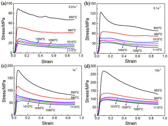 Ture stress–strain curves under different thermal compression conditions: (a) 0.01 s−1, (b) 0.1 s−1, (c) 1 s−1, and (d) 10 s−1.
