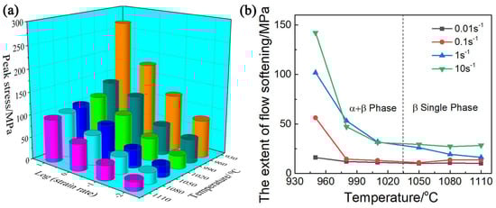 The relationship curves between true stress and strain obtained for Ti65 alloys for various deformation states, are shown in Figure 5. Due to the work-hardening effect, the flow stress rises rapidly in the early stages of compression until it reaches a maximum value in the small strain state [14,15]. The results show that the initial strength increase in the stress–strain curve is primarily attributed to the generation, migration, and proliferation of dislocations [10,16]. At the same time, dynamic recovery, dynamic recrystallization and spheroidization of α phase are difficult to occur at the initial stage of deformation [17,18]. The maximum values of stress also vary depending on the deformation parameters, as illustrated in Figure 6a. With the increase in temperature and decrease in strain rate, the peak stress shows a decreasing trend. The reason for this phenomenon is that the rate of dislocation propagation is significantly higher at high strain rates, which leads to greater work-hardening effects and ultimately to higher rheological stress [19]. On the other hand, with the increase in temperature, more α phase transforms into β phase. β phase has more slip systems than α phase, and exhibits higher deformability, resulting in obvious softening effect. Figure 6b illustrates the flow softening effect () [20] for various deformation conditions. The softening degree of Ti65 alloy decreases with increasing temperature and decreasing strain rate, and the softening tendency of the alloy in the two-phase region is more obvious than that in the single-phase region, which aligns with the findings of other researchers [21,22]. The fluctuation in the degree of flow softening, as temperature rises and strain rate decreases, is ascribed to the evolution of microstructure, deformation mechanism and deformation heating, such as variations in grain morphology and size, dislocation fraction, and phase composition [23,24,25]. Discontinuous yielding phenomenon (DYP) was observed at strain rates of 0.1 and 1 s−1 and temperatures of 1010 °C and 1050 °C. At the beginning of the deformation, a large accumulation of dislocations occurs along the grain boundaries, leading to a sudden increase in the value of a flow stress. Once the dislocation density exceeds a specific threshold, pinned dislocations cross the boundary, causing the elimination of dislocations and subsequent decrease in flow stress [26].