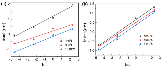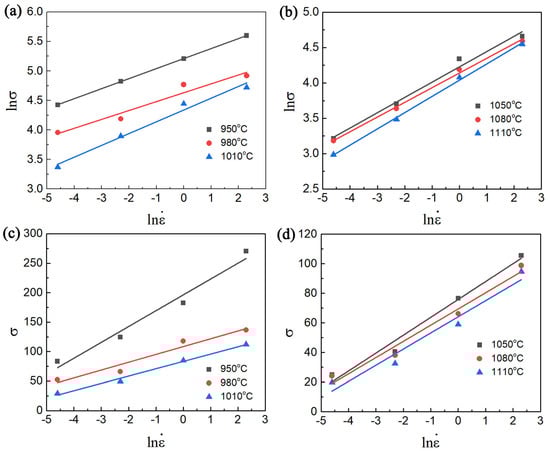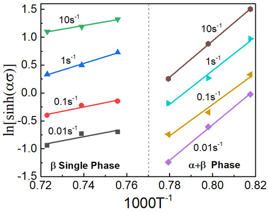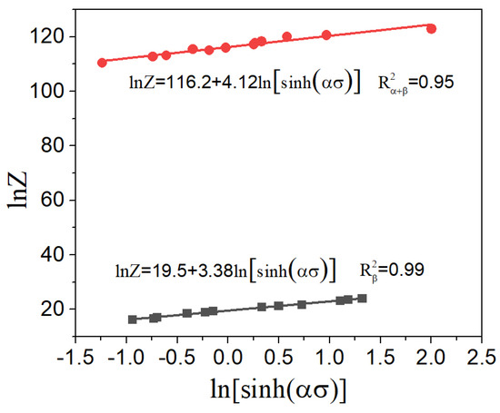The deformation activation energy Q was calculated to be 1172.167 and 238.728 kJ/mol in the two-phase field and single-phase field, respectively. Researchers [9,29,30] have suggested considering the effect of temperature on strain rate perturbation. The Z parameter can be described by the following formula: