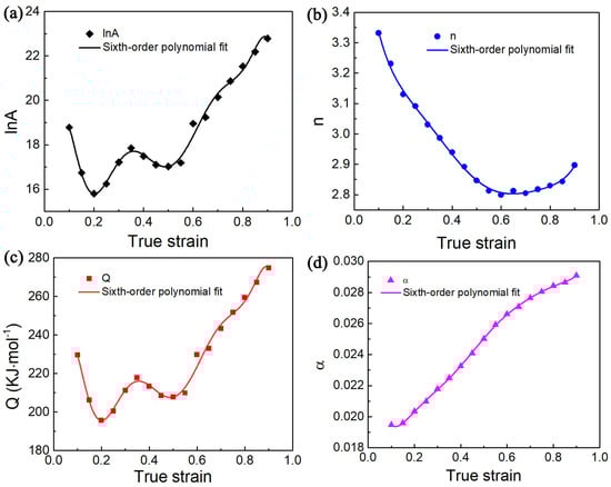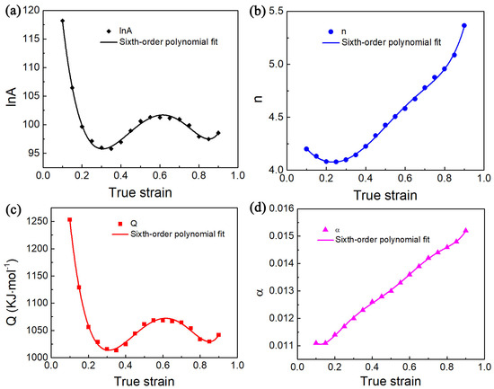 Correlation fitting curves between four material parameters ((a) ln A; (b) n; (c) Q and (d) α)) and strain value by employing the sixth-order polynomial fitting method in the single-phase region.