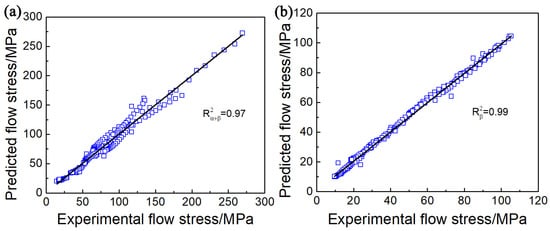 Figure 13a,b illustrates the measured and estimated flow stress values of the Ti65 alloy using the Arrhenius type constitutive model in different phase regions, respectively. In addition, the correlation coefficient (R) and the average absolute relative error (AARE) are used to demonstrate the precision of the established model: