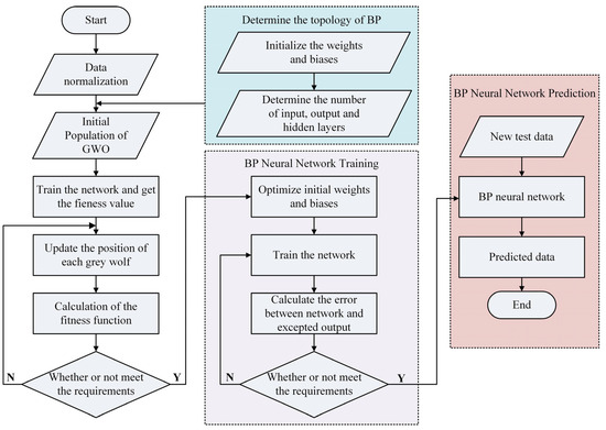 Flow chart of the proposed procedure for the GWO–BP machine learning algorithm.