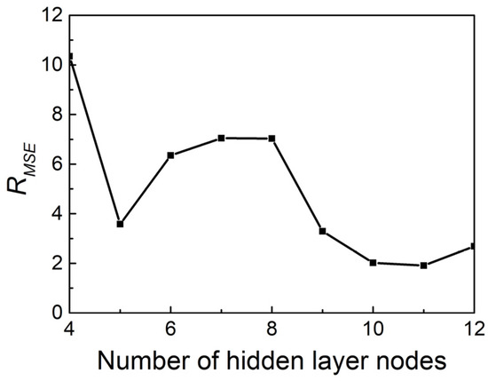 where is a value of the experimental strain rate, and is a value of normalized data. The GWO–BP model was trained using a random selection of 75% from the experimental datasets. The remaining 25% of the datasets were used to assess the efficiency of the established model, specifically within a strain range of 0.05 to 0.9. Tansig and purlin are the activation function used in the hidden and output layer, respectively. Trainlm is employed as a training function. The GWO–BP algorithm has the following settings: the model’s maximum number of repetitions is set to 2000, with a target error of 10−6, and the learning rate is set at 0.01. Root mean square error (RMSE) calculated by Equation (18) was used to determine the appropriate number of hidden layer nodes of GWO–BP.