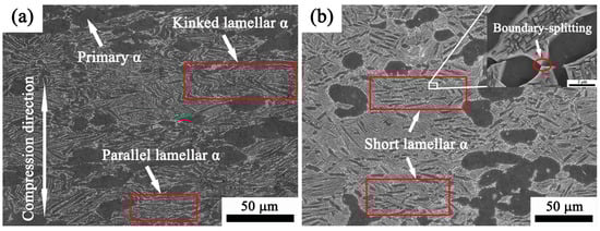 Figure 18 shows the effect of temperatures during deformation on the microstructure of Ti65 at a strain rate of 0.1 s−1. The deformation temperature has a major impact on the evolution of the microstructure. The shape and spatial arrangement of the lamellar α have changed considerably compared to the initial bimodal microstructure (Figure 1). As shown by the red circle in Figure 18a, the lamella α exhibits a concentrated distribution pattern vertical to the compression direction during deformation at a temperature of 950 °C. The transition from a uniform distribution (original microstructure) to a centralized distribution suggests that the lamellar α-structure will gradually rearrange itself perpendicular to the compression axis during deformation [40]. Comparing Figure 18a,b, it can be found that, when the deformation temperature rises, the volume proportion of the αp gradually decreases, and the grain morphology also changes gradually, becoming increasingly equiaxed with a smaller aspect ratio. This may be due to the microstructure coarsening of primary α induced by element diffusion during hot deformation [41]. In addition, certain structures exhibit bending or kinking, as highlighted by the red circle in Figure 18a. The lamellar α phase exhibits significant heterogeneity in terms of its spatial trace orientation, bending, and kinking. The grain shape of the α colony during the compression depends mainly on the angle between the c-axis of the α phase and the compression axis. Thomas et al. [42] demonstrated that, when the c-axis of α phase in the colonies is parallel to the loading direction, the lamellar α phase displays a hard orientation, which is prone to distortion or bending during the subsequent thermal deformation and is not susceptible to spheroidization. As the temperature increased to 980 °C, seen in Figure 18b, the grain of the partial lamellar became short-bar in morphology, and the aspect ratio decreased. Formation of a short bar-like α phase may be a prerequisite for the occurrence of spheroidization, which can be seen as localized enlargement in the top right corner of Figure 18b, and boundary-splitting can be demonstrated in the present study for dynamic globularization. The process of boundary-splitting frequently takes place during the hot deformation and heat treatment of near-α and α + β phase titanium alloys [11,43]. Dislocation interfaces in lamellar α are first formed during the deformation, and the appearance of the sub-boundaries disrupts the surface tension equilibrium at the borders between the α and β phases. As a result, the sub-boundary becomes thermodynamically unstable, and a heat cup is formed. Then, α/α sub-boundaries are penetrated by β phase through the site of thermal cups and separate the lamellar α into bamboolike morphology or a near-equiaxed shape. Finally, with the further migration of β-phase stabilizing elements, dynamic globularization of lamellar α can develop.