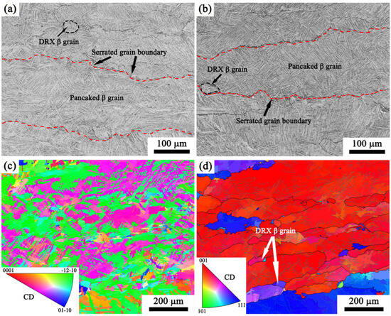 Microstructure of Ti65 alloy subjected to compression at 0.1 s−1 in the single-phase region: (a) 1050 °C, (b) 1110 °C, (c) the inverse pole figure map of αS precipitated in β grains under deformation at 1110 °C, (d) reconstruction IPF map of high temperature β grains corresponding to (c).