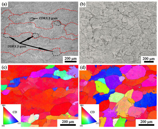 Microstructure of Ti65 alloy compressed at 1110 °C in the single β phase: (a) 0.01 s−1, (b) 10 s−1, (c) reconstruction IPF map of high temperature β grains under the strain rate of 0.01 s−1; (d) reconstruction IPF map of high temperature β grains under the strain rate of 10 s−1.