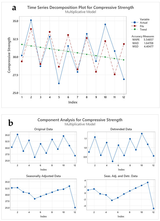 An analysis of compressive strength values for three different variables is offered in Figure 6a. The variables mentioned are “actual”, “fits”, and “trending line”, and the analysis incorporates certain key performance indicators such as MAPE (Mean Absolute Percentage Error), MAD (Mean Absolute Deviation), and MSD (Mean Squared Deviation). MAPE is a measure of the prediction accuracy of a forecasting method, often used in the context of time series analysis. It calculates the average percentage difference between the forecasted and the actual values. In this case, the MAPE value of 5.54857 indicates the average percentage error between the predicted and actual values for the compressive strength. MAD is a statistical measure that calculates the average of the absolute deviations of a set of values from their mean. It gives an insight into the variability within the dataset. The value of 1.64708 represents the average absolute difference between the individual compressive strength values and their mean. MSD is a statistical measure that calculates the average of the squares of the differences between the predicted and actual values. It helps us understand the average magnitude of the errors or deviations. The value of 4.40477 is the average squared difference between the predicted and actual compressive strength values.