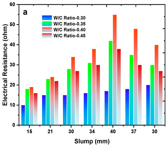 The electrical resistance analysis for (a) slump and (b) viscosity. The electrical resistance of the material under study ranges from 0 to 60 ohms. In contrast, the slump values range from 15 to 60 mm, depending on the water-to-cement (W/C) ratio, which varies from 0.30 to 0.45, shown in Figure 7. For a W/C ratio of 0.40, the highest slump value of 40 mm is observed when the electrical resistance is 55 ohms. As the W/C ratio increases, the slump value and electrical resistance increase up to a W/C ratio of 0.40. However, beyond this point, a decline in performance (viz., Figure 7a).