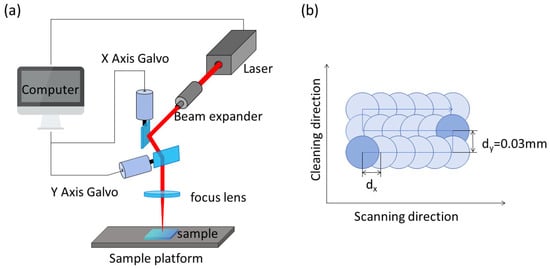 Figure 1a displays the laser cleaning test system’s schematic diagram.