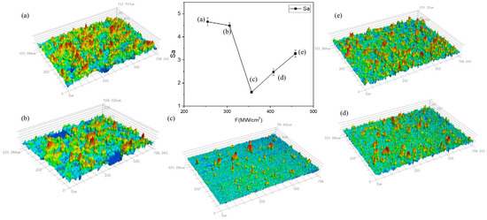 When the power density is low, the upper layer of paint is heated to the point where it melts the least, softens or melts, and is removed; close to the substrate of the paint layer, the temperature does not reach the melting temperature. As the laser power density increases, more energy is transferred to the paint layer’s surface through irradiation, improving the area of the substrate exposed to an increase in the paint layer’s MMR. As the power density reaches 356.51 MW/cm2, the MMR reaches 100%, and it is evident that the surface has polished traces. The paint layer absorbs a significant amount of energy from the laser’s direct irradiation, and the paint layer separates from the aluminum substrate’s surface due to thermal expansion brought on by thermal stress. As shown in Figure 3(c1,c2), the aluminum substrate slightly melts after reaching its lowest melting point, resulting in a few micro-pits created by ablative melting in the central area of the cleaning path during laser scanning. When the laser power density is increased further, the aluminum substrate’s surface temperature reaches the lowest melting point, leaving grooves from melt spattering and laser ablation. Numerous wavy honeycomb traces form, indicating that the substrate’s surface is seriously damaged. Figure 4 displays the variance in surface roughness of the cleaned specimens at various power densities.