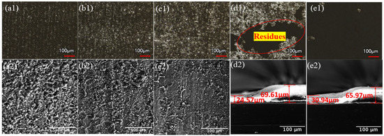 The MMR was measured to be 73.56% at a power density of 254.65 MW/cm2 and 82.79% at 305.58 MW/cm2. The macroscopic and microscopic morphology under different power densities at a scanning speed v = 500 mm/s and repetition frequency f = 20 kHz are shown in Figure 3. The cross-section part was taken when the paint layer could not be completely cleaned, as shown in Figure 3(a2,b2).