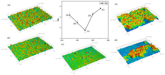 Roughness of cleaned specimens at different scanning speeds. v = (a) 300; (b) 400; (c) 500; (d) 600; and (e) 700 mm/s.