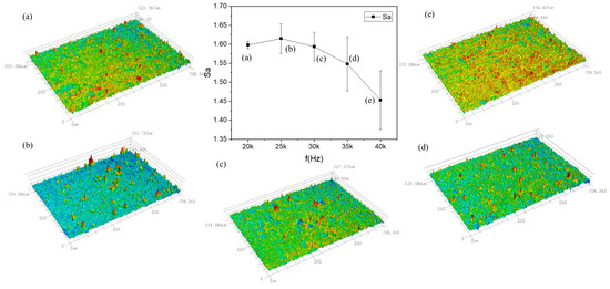 Roughness of cleaned specimens under different pulse frequencies at P = 14 W. f = (a) 20; (b) 25; (c) 30; (d) 35; and (e) 40 kHz.