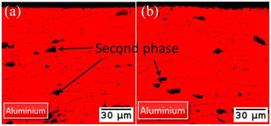 The cross-sectional phase distribution diagrams are displayed in Figure 9 and are from EBSD tests conducted on the cross-sections of the original aluminum alloy plate and the cleaned substrate aluminum alloy plate, respectively. The second phase visible in the figure is represented by the black portion. This black portion represents the reinforcing phases of other elements, like Mn, Ti, and Mg. Since these phases are not discussed in this paper, they are not analyzed here. As the images show, all of the substrates are aluminum phase, and there is no phase change throughout the laser’s cleaning process since the phase of the laser-irradiated surface does not differ from the phase of the non-laser-irradiated surface.