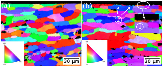The cross-section’s inverse pole figure (IPF) is displayed in Figure 10. Both the original aluminum alloy substrate and the sample’s cross-section following laser cleaning lacked a substantial grain orientation, as indicated by the IPF patterns. The initial aluminum alloy substrate’s grain size is fairly uniform, as can be seen in Figure 10b. In area 1, the appearance of fine grains in some areas close to the substrate’s surface suggests that there is some grain refinement and recrystallization on the surface of the laser-irradiated substrate. A portion of the grain color gradient can be seen in Figure 10b, area 2. This gradient shows that the substrate’s surface can absorb laser energy and that some stress concentration causes some grains to accumulate dislocations. If stress is further concentrated, grain boundaries will result, and fine grain formation will begin preferentially along the grain boundaries.