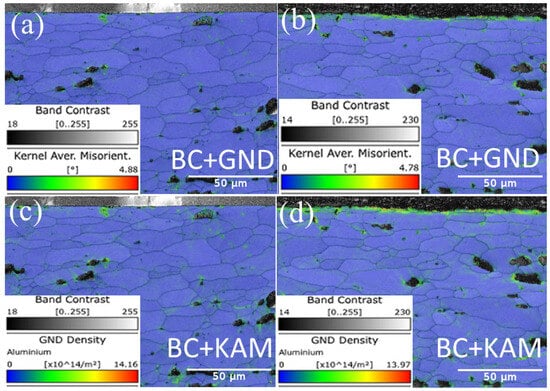 The distribution of the kernel’s average misorientation (KAM) and geometrically necessary dislocation (GND) for the original substrate vs. the cleaned substrate cross-section is displayed in Figure 11.