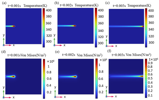 Temperature field and stress field distributions at different moments. t = (a,d) 0.001; (b,e) 0.002; and (c,f) 0.004 s.