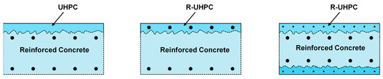 Ultra-high-performance concrete (UHPC) is a superior cement-based material, especially in terms of tensile behavior and durability [1,2]. Owing to these attributes, UHPC has emerged as the material of choice for augmenting the mechanical properties and durability of engineering structures subjected to severe service environments [3,4]. It finds application in bridge decks for withstanding substantial and complex loads [5,6], in underground structures to impede water intrusion [7,8], and in strengthening existing structures to bolster their load-bearing capacity and extend their service life [9,10]. However, the considerable use of steel fibers substantially escalates the cost of UHPC. The material cost of UHPC with a 2% fiber volume fraction is roughly 10 to 20 times higher than that of ordinary concrete, with steel fibers representing 30% to 50% of the total expenditure. This cost factor limits its application to certain critical components [11,12], such as reinforcement and protective layers for structural members, as shown in Figure 1.