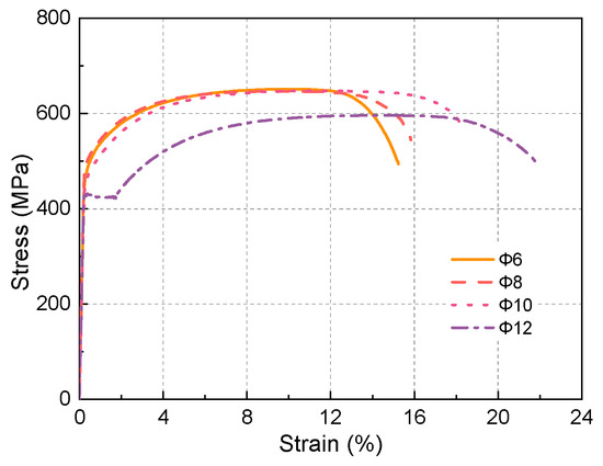 Four different diameters of HRB400 bars (6 mm, 8 mm, 10 mm, and 12 mm) were employed in the experiments. The mechanical properties of the rebar were tested according to the Chinese specification GB/T228.1 [41] and the stress–strain curves are shown in Figure 2 and the essential performance parameters are cataloged in Table 2. It is noteworthy that the rebar with a 12 mm diameter, due to its particular yield plateau, exhibited superior fracture ductility compared to the other diameters, as illustrated in Figure 2. This disparity in performance among different diameter rebars aligns with engineering practice. Typically, rebars with diameters smaller than 12 mm are transported as bar coils and require straightening prior to usage, a process that induces plastic deformation and consequent loss of the yield plateau.