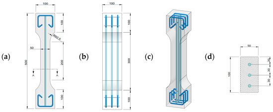 R-UHPC specimen details: (a) front view; (b) side view; (c) isometric view; (d) A-A section view [42].
