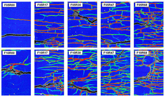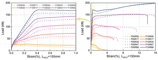 As demonstrated in Figure 8, the UHPC exhibited completely different failure modes before and after rebar reinforcement for the same fiber volume fraction, the non-blue stripe in the figure shows the location of the crack. At a fiber volume fraction of 0.5%, UHPC experiences fracture predominantly at a single surface, with minimal occurrence of multi-cracks on the flanks of the fracture surface. This finding indicates that the bridging effect provided by the steel fibers at the fracture surface at this fiber volume fraction is insufficient to induce multi-cracking behavior. Upon elevating the fiber volume fraction to 1.0%, while UHPC continues to fracture predominantly on a single surface, the bolstered bridging effect facilitated by the fibers leads to the emergence of several multi-cracks on the flanks of the fracture surface. Upon reinforcement with rebars, the failure mode of UHPC remains a single surface fracture, but as the reinforcement ratio increases, the phenomenon of secondary fracture surface initiating outside the main fracture surface becomes more evident. For example, in the specimens with a reinforcement ratio of 6.8% (F05R68 and F10R68), fracture surfaces initiate on the left and right sides of the specimen, respectively, and gradually develop through with increasing strain. In the specimens with a reinforcement ratio of 4.7% (F05R47 and F10R47), the development of secondary fracture surfaces outside the main fracture surfaces is also more apparent. From the perspective of restricting the maximum crack width propagation, the occurrence of secondary fracture surfaces is beneficial.
