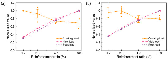 Effect of reinforcement ratio on R-UHPC feature load: (a) 0.5% fiber volume fraction; (b) 1.0% fiber volume fraction.