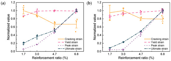 Effect of reinforcement ratio on R-UHPC feature strain: (a) 0.5% fiber volume fraction; (b) 1.0% fiber volume fraction.