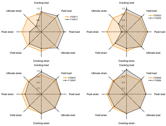 Figure 10 and Figure 11 delve further into the impact of varying the reinforcement ratio on the mechanical properties of R-UHPC. The yielding point is determined by R. Park’s method [47]. All feature loads and strains are normalized. For instance, in R-UHPC with a fiber volume fraction of 0.5%, the specimen with a reinforcement ratio of 6.8% boasts the maximum average peak load, so the normalized benchmark of the peak load for all R-UHPC with a fiber volume fraction of 0.5% is defined as this average peak load. The data before normalization are shown in Table 4 and Table 5. As shown in Figure 10, the cracking load of R-UHPC generally diminishes in response to an increased reinforcement ratio. This is attributable to a larger reinforcement ratio yielding a more substantial inhibitory effect on UHPC autogenous shrinkage, resulting in amplified tensile stress being introduced into the UHPC before testing [48]. Since the same UHPC is used, both the yield and peak loads of R-UHPC approximately linearly escalate with the increase in the reinforcement ratio.