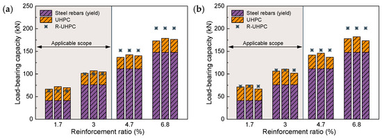 Calculation of the load-bearing capacity of R-UHPC based on the yield strength of steel rebar: (a) fiber volume fraction of 0.5%; (b) fiber volume fraction of 1.0%.